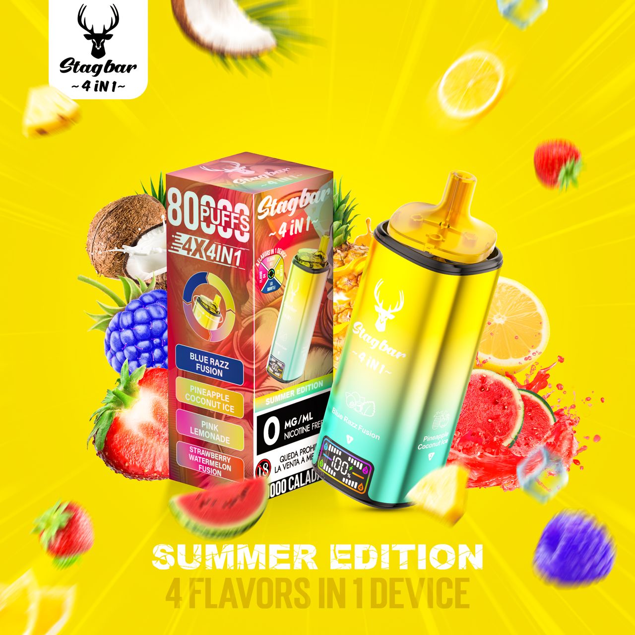 El Stagbar 4 en 1 Summer Edition está hecho para quienes quieren disfrutar del auténtico sabor del verano en cada calada. Con hasta 80.000 caladas y sin nicotina, este vape desechable ofrece una experiencia refrescante, ligera y llena de energía.